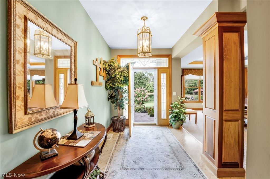 and large windows that frame serene views of the outdoors. The spacious kitchen features custom hickory cabinetry,