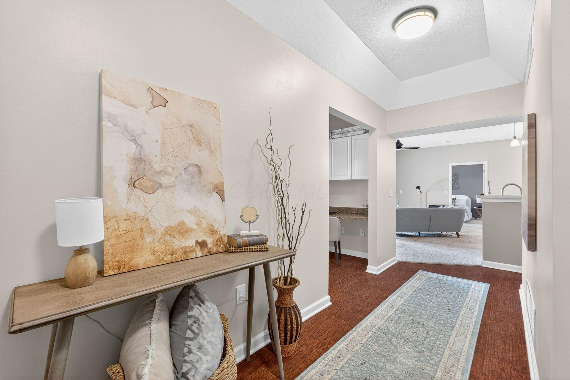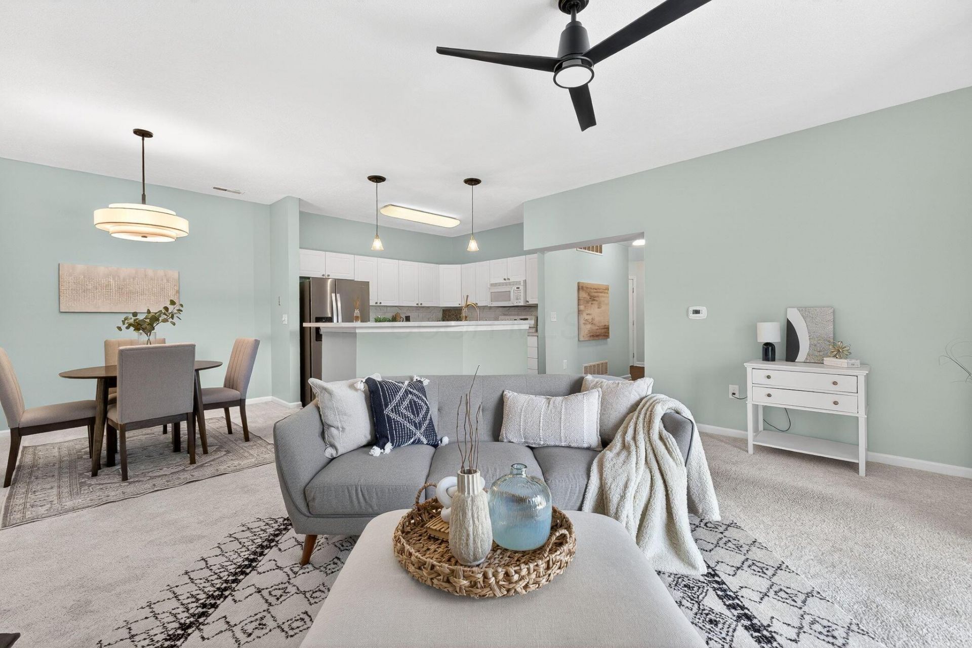 Amazing value to own a 2 BR, 2 BA condo in Olentangy schools district!! This one-level, first floor condo is located in a beautifully maintained community which includes a pool, fitness facility, clubhouse, walking paths, ponds, & green space. Living room features a gas log fireplace and sliding glass doors which lead to a covered patio. The kitchen has plenty of cabinetry space and counters for any cook. The 2-tier island contains the sink, so even the cook isn't left out of any gathering. The primary suite features fresh paint, new ceiling fan w/ light, a generous walk-in closet, plus an en-suite bathroom. The bathroom has an updated light fixture, sink faucet, & hardware; complete with glass door walk-in shower. Additional features include a secure building entry, wood-look vinyl flooring through the foyer and hallway, 1-car garage and assigned space, in-unit laundry room (washer & dryer convey). Just minutes to Polaris Fashion Place, major freeways, and alum creek state park. Community roofs just replaced last year. Carrier A/C unit 2024, cellulose insulation, and so much more (see full list of improvements under documents). Maintenance free living, all in a prime location!